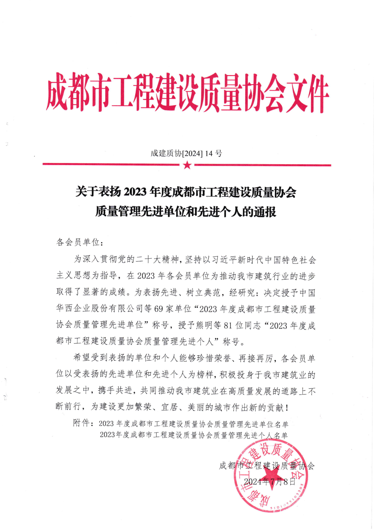 中誠投建工集團(tuán)榮獲成都市2023年度質(zhì)量管理先進(jìn)單位稱號
