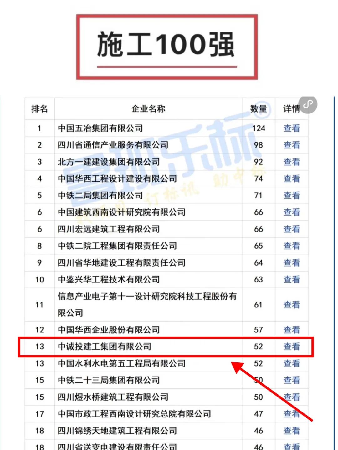 中誠投建工集團(tuán)榮登2024年上半年四川省施工中標(biāo)100強(qiáng)榜單