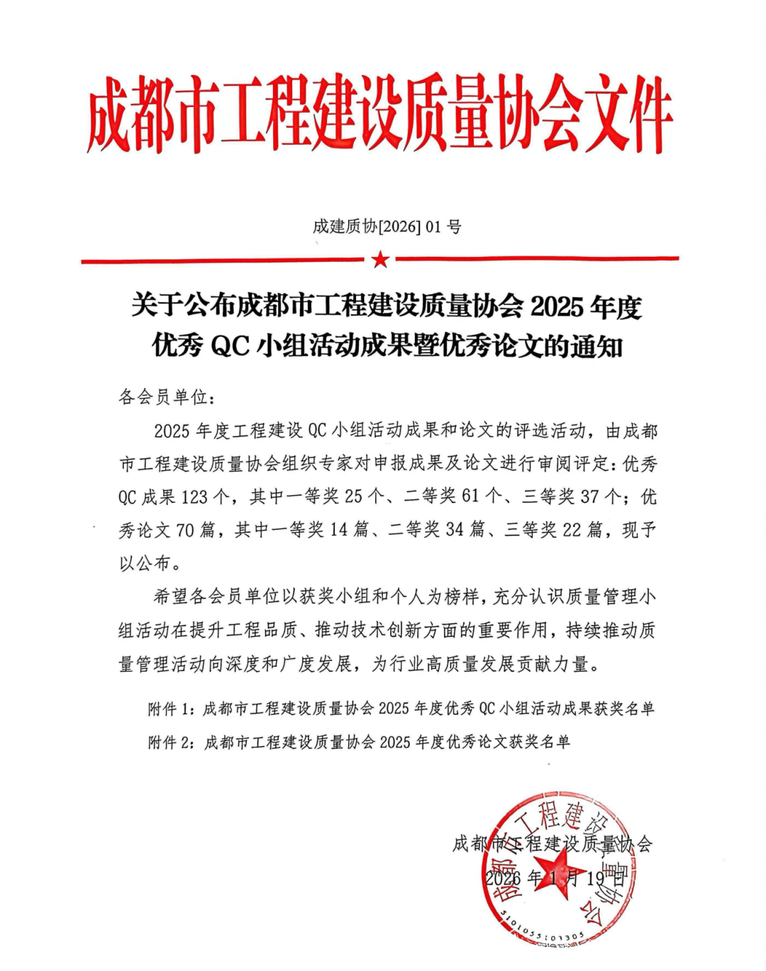 近日,成都市工程建設質量協會公布2025年度優秀QC小組活動成果及優秀論文評選結果。中誠投建工集團申報的3項QC小組活動成果,均榮獲