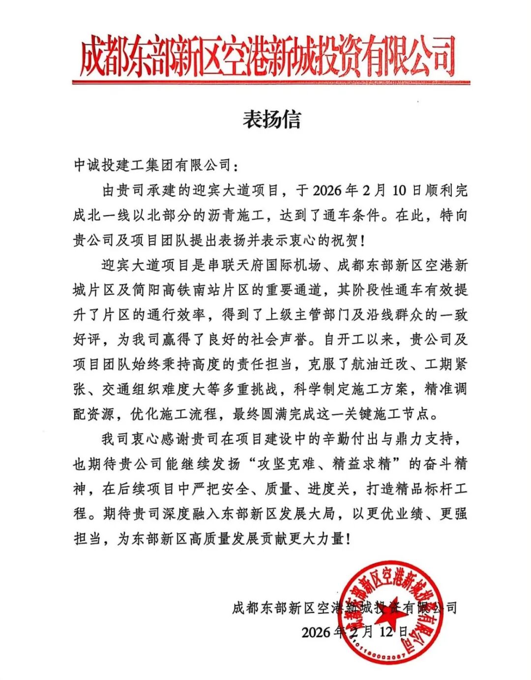 2月12日,中誠投建工集團收到成都東部新區空港新城投資有限公司發來的表揚信,對集團公司承建的迎賓大道項目高效完成北一線以北區域