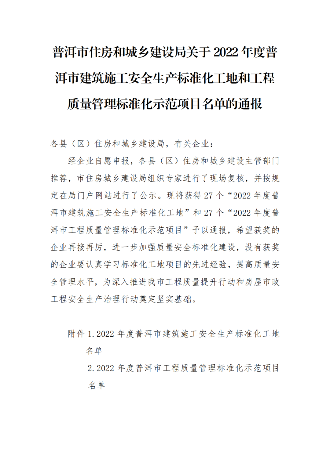 近期,云南省普洱市住房和城鄉(xiāng)建設(shè)局發(fā)布了《關(guān)于2022年度普洱市建筑施工安全生產(chǎn)標(biāo)準(zhǔn)化工地和工程質(zhì)量管理標(biāo)準(zhǔn)化示范項(xiàng)目名單的通