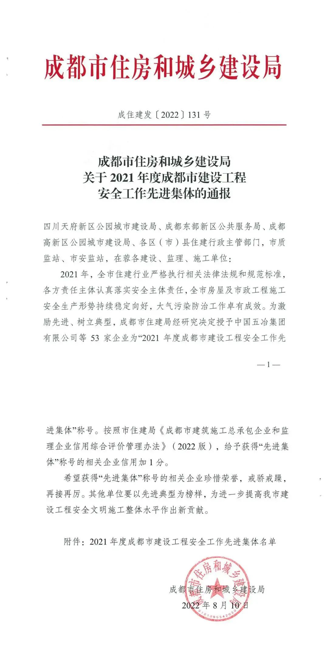 集團公司獲評2021年度成都市建設(shè)工程安全工作先進集體