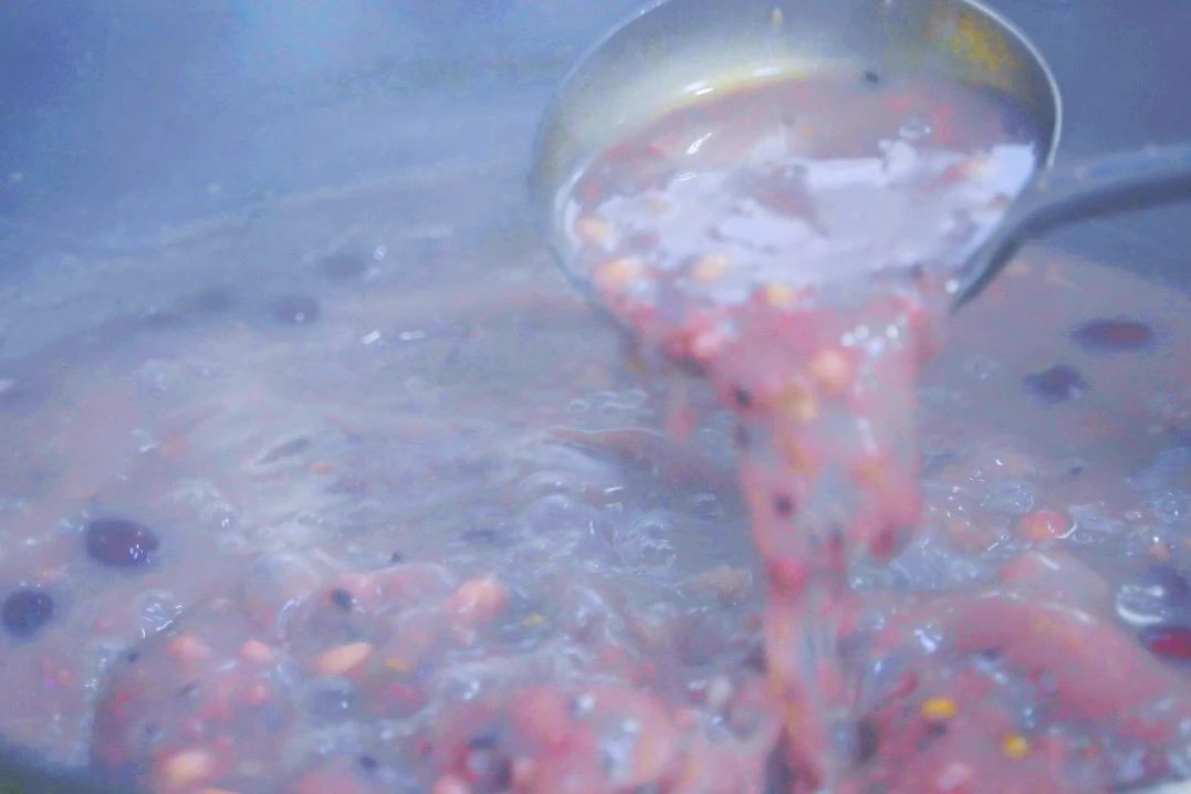 1月18日,一大早食堂師傅們就開始忙碌,挑選上好的綠豆、紅豆、薏米、大棗、花生、蓮子等臘八食材混合一起,按比例放入鍋中,經過小火慢慢熬制3個小時,匯聚成了一大鍋香噴噴的臘八粥。