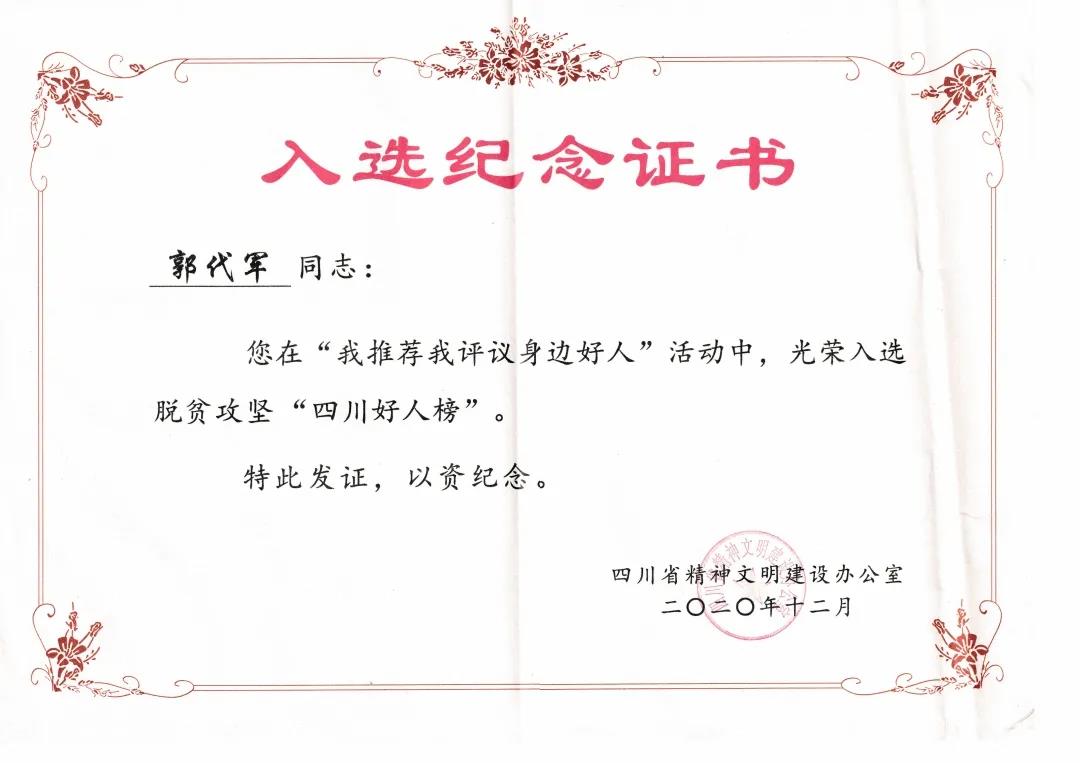 2020年是決勝全面小康、決戰(zhàn)脫貧攻堅(jiān)收官之年。為廣泛宣傳艱苦奮斗、真抓實(shí)干的脫貧攻堅(jiān)典型事跡和感人故事,12月30日,由省文明辦主辦的脫貧攻堅(jiān)“四川好人榜”專場(chǎng)發(fā)布儀式在蓉舉行,現(xiàn)場(chǎng)發(fā)布了脫貧奮進(jìn)、扶貧擔(dān)當(dāng)、愛(ài)心助貧三類“四川好人榜”共50人。集團(tuán)公司董事長(zhǎng)郭代軍入選評(píng)為“愛(ài)心助貧”四川好人。