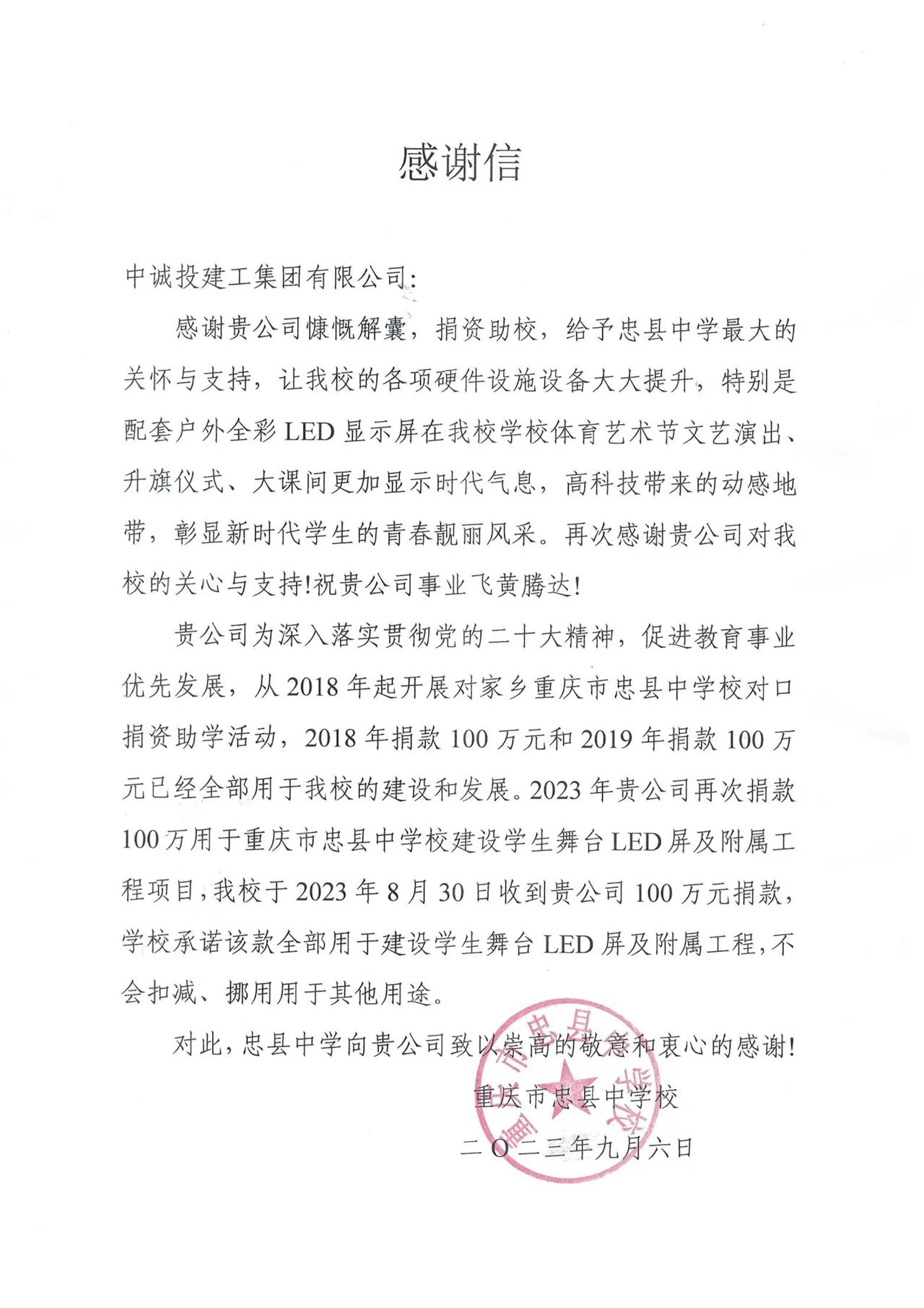 9月7日,重慶市忠縣中學校發(fā)來感謝信,對中誠投建工集團再次捐贈100萬元助力學校建設(shè)學生舞臺LED屏及附屬工程項目表示衷心的感謝。