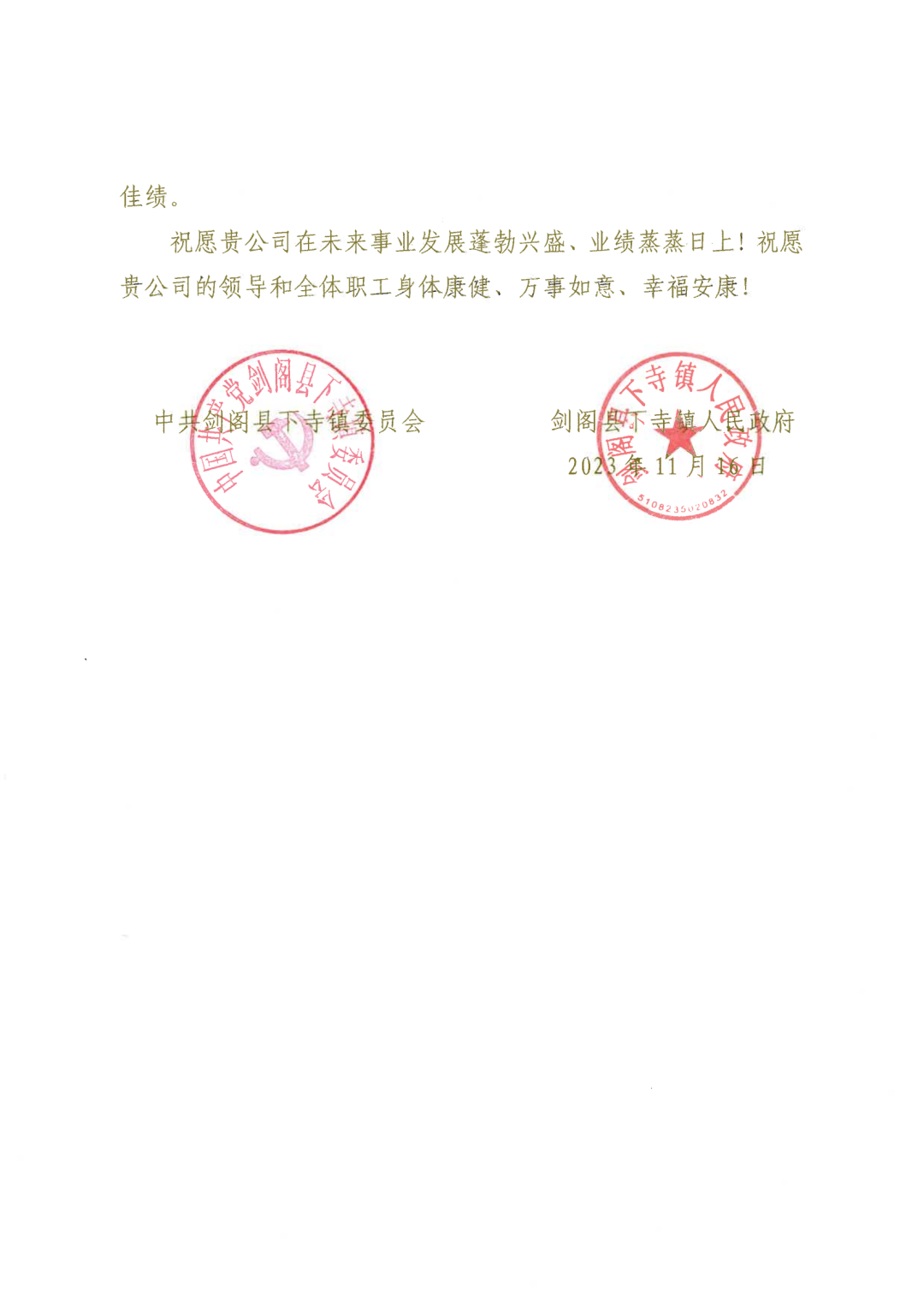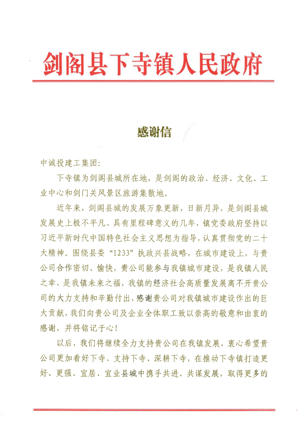 信中,下寺鎮人民政府向中誠投為當地城市建設與經濟社會高質量發展作出的重要貢獻致以深深的感謝,并表示將繼續全力支持中誠投在下寺鎮的項目建設與發展,共同打造更好、更強、宜居、宜業縣城。